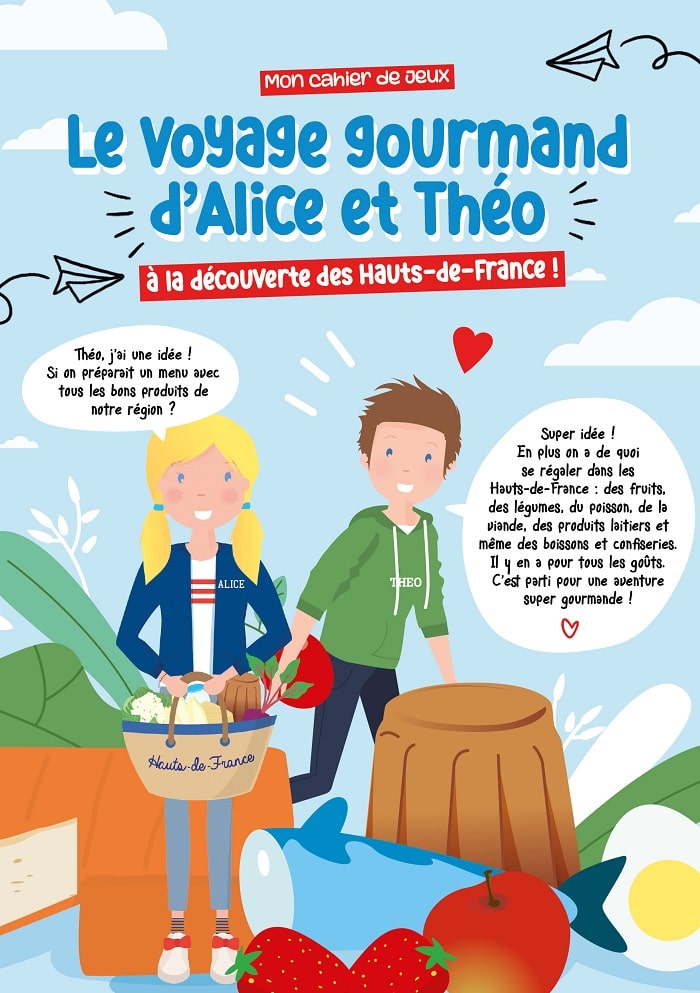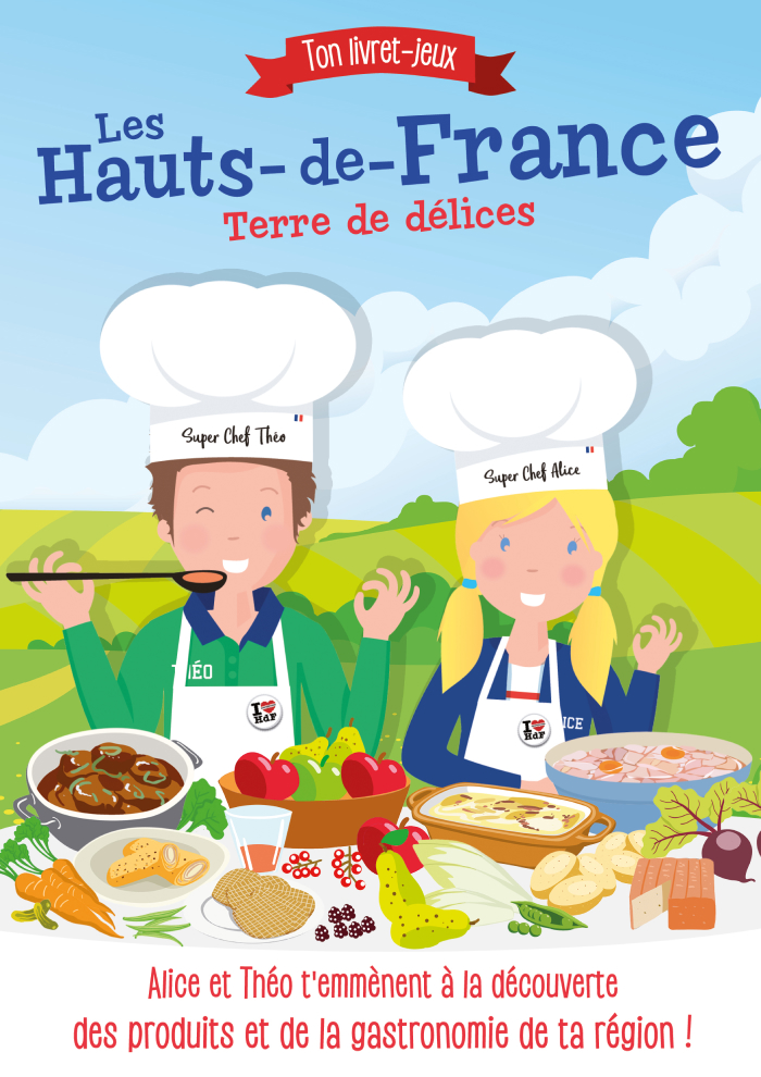 Des pommes, des poires mais aussi des endives, des pommes de terre, de la viande et du fromage… Dans les Hauts-de-France, tout est bon ! Bienvenue au pays de la gastronomie en compagnie d’Alice et Théo les deux mascottes ! Vos enfants pourront s’amuser et découvrir des produits régionaux et des recettes à cuisiner avec l’aide d’un adulte !